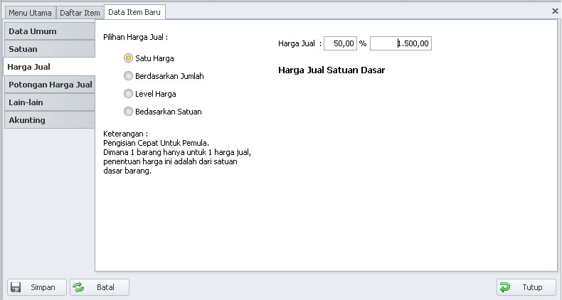 Berdasarkan Satuan : Harga jual langsung berdasarkan satuan, tanpa ada perhitungan jumlah atau level.