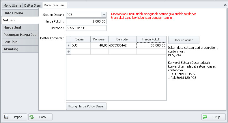 Tombol “Hitung Harga Pokok Dasar” Untuk mencari harga pokok dasar, dihitung dari satuan terbesar.